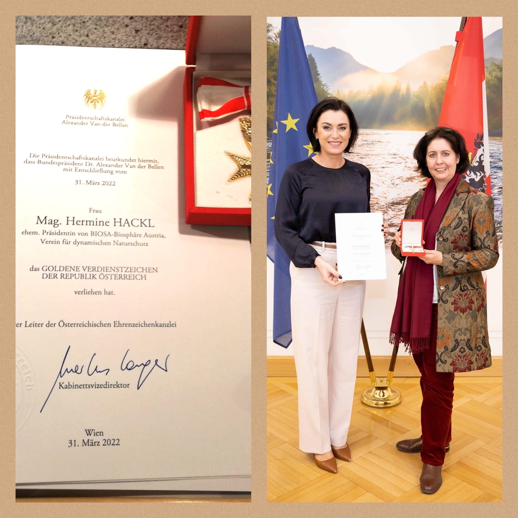 Bundespräsident Alexander Van der Bellen hat Hermine Hackl, unseren langjährigen BIOSA-Präsidentin und jetzigen Ehrenpräsidentin, das Goldene Verdienstzeichen der Republik Österreich verliehen.